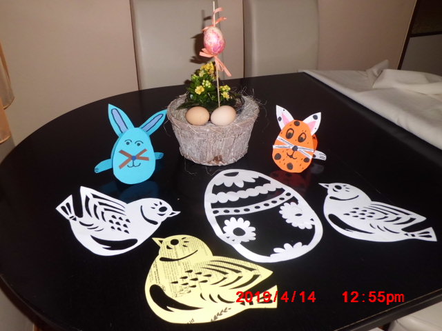 Dále následovalo velikonoční vyrábění, na které se děti asi nejvíce těšily. Mohly si vybrat z několika námětů, např. vystřihovánky na okno, velikonoční přání, figurku zajíčka nebo výrobu kuřátka z vyfouklého vejce. Pomáhalo nám také několik přítomných maminek. Ani jsme se nenadáli a dvě hodiny utekly jako voda.